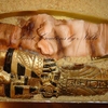Egyptian mummy cake - raspberry cake with chocolate frosting. Fondant wrapped mummy, hand sculpted lid and sarcophagus made out of modeling chocolate. Lid is hand painted with gel food coloring. 'Sand' made out of graham crackers.