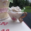 Everything is edible. Bottom cake is made of 2 8" rounds and a 7" round in the middle to give it a tapered shape. Tea pot cake is made from the Wilton ball pan mold. The tea cups are all gum paste that I molded in a martini glass. The letters are funky letter tapits. The roses, tulips, leaves and baby's breath are all gum paste. Buttons and fabric doilies are all gum paste as well.