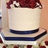 Navy Blue, Burgundy & Ivory cupcake tower with handmade gum paste rosettes and sugar pearls on each cupcake. Cake topper is covered in ivory fondant with swiss dots topped with handmade gum paste burgundy roses, ivory hydrangeas and filler flowers. Stand was custom made by my wonderful boyfriend!