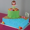 Luau cake made for a girl's 7th birthday. Bottom tier is fresh strawberry cake w/strawberry filling, top tier is dark chocolate cake w/peanut butter filling. Frosted in homemade BC, decorations are brown sugar, fondant and gumpaste.