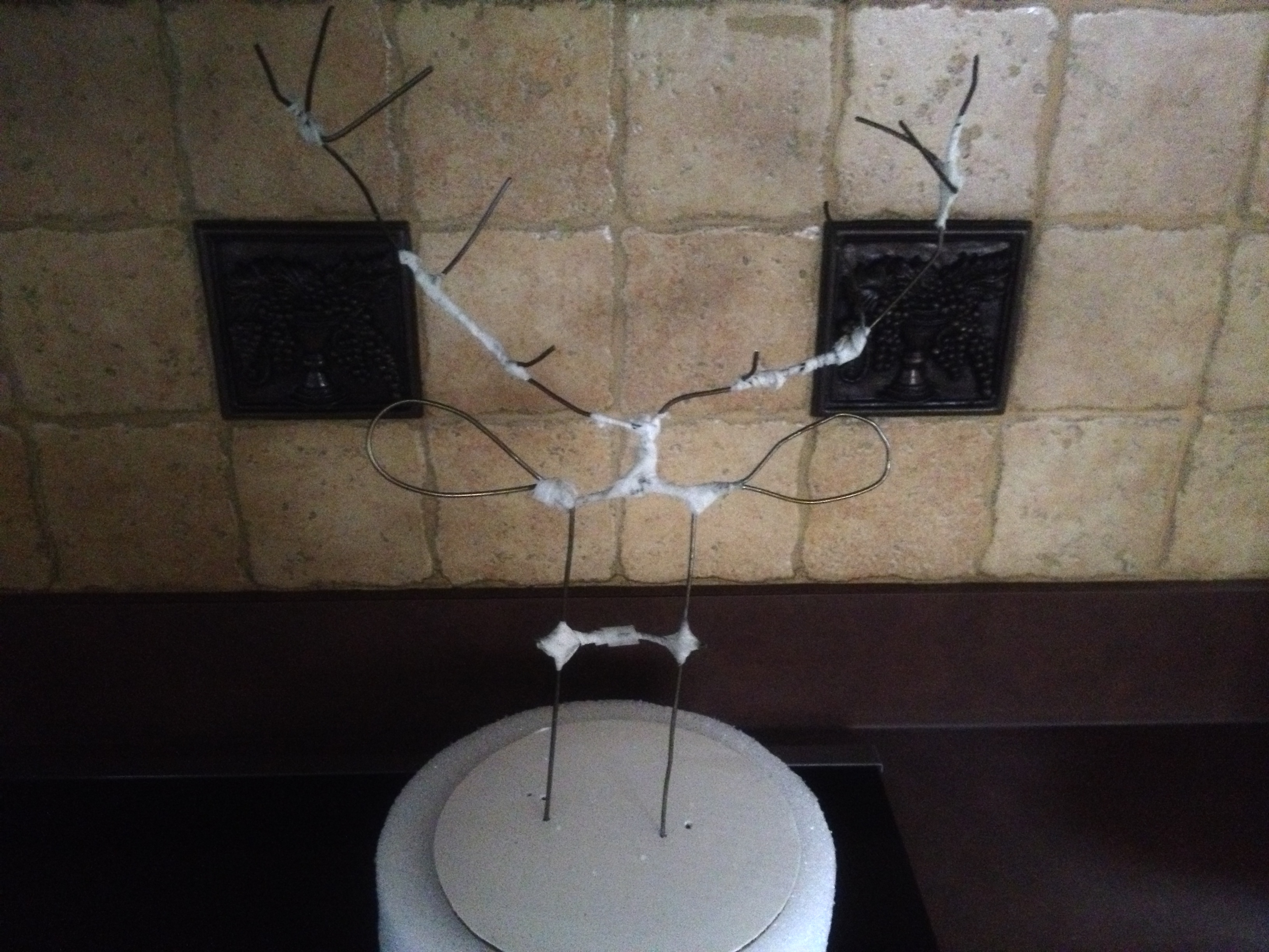 two tier cake , lower one was cappuccino cake withcoffee mascarpone cheese filling , upper tier was chocolate and vanilla cake with chocolate mousse filling ,the head frame was made from heavy wire and floral tape , rice crisp treat , covered by chocolate fondant and white fondant top layer , colored all decorations and head with pearl dust and gel color .