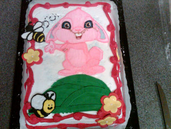 Our Daughter was coming for a visit and bringing our one year old Grand Daughter. I wanted to bake her a cake but our oven was out. I waited until the last possible second and the part still hadn't arrived. So, I got the bright idea to buy a store bought cake with just the boarder around it and add a cute flooded royal icing transfer. The only "undecorated" cake I could find had a red boarder and I had already made a pink bunny. I took the cake home and realized that the bunny and grass barely fit the cake. I thought I could still make it work but when I put the transfer on and peeled back the paper I realized that the bunny looked....well...demented. It looks better in the photo than it did in person. I was seriously worried that our little Grand Daughter would be traumatized by the scary bunny. Thank goodness she wasn't but every time I say I'm going to do a transfer my husband asks ..."will it have eyes? You're not too good with eyes". In person this pink bunny really was creepy. lol