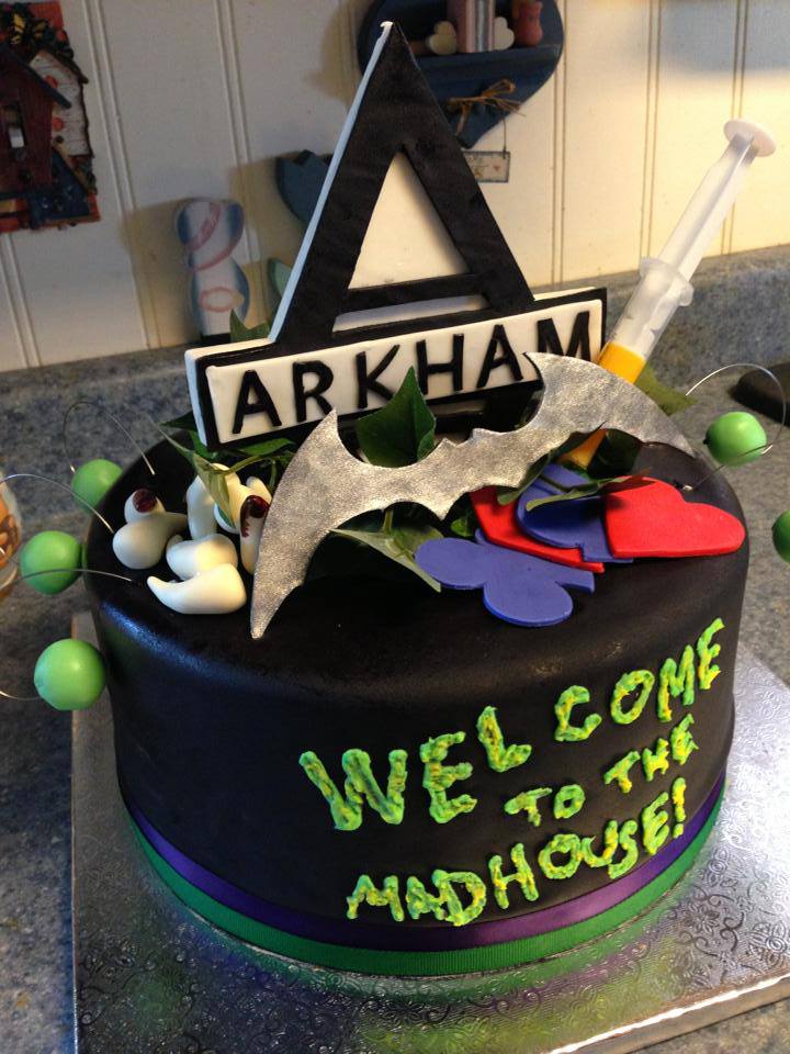 Each of the villains is represented in small ways. Joker, the main baddie, is mainly in the color scheme and the whimsical floating green orbs (as they reminded me of a clown), as well as the front piping, which is a recreation of a phrase that Joker spray pained on a wall in one of the game's advertisements (plus how perfect was it that the phrase happened to work for a house warming?!?). Harley Quinn was the red and purple card suits. Killer Croc was the blood stained teeth on the left side. Scarecrow was the syringe of his Fear Toxin. Poison Ivy was the creeping vines. And of course, we have a Batarang front and center, because what would a Batman cake be without Batman saving the day?