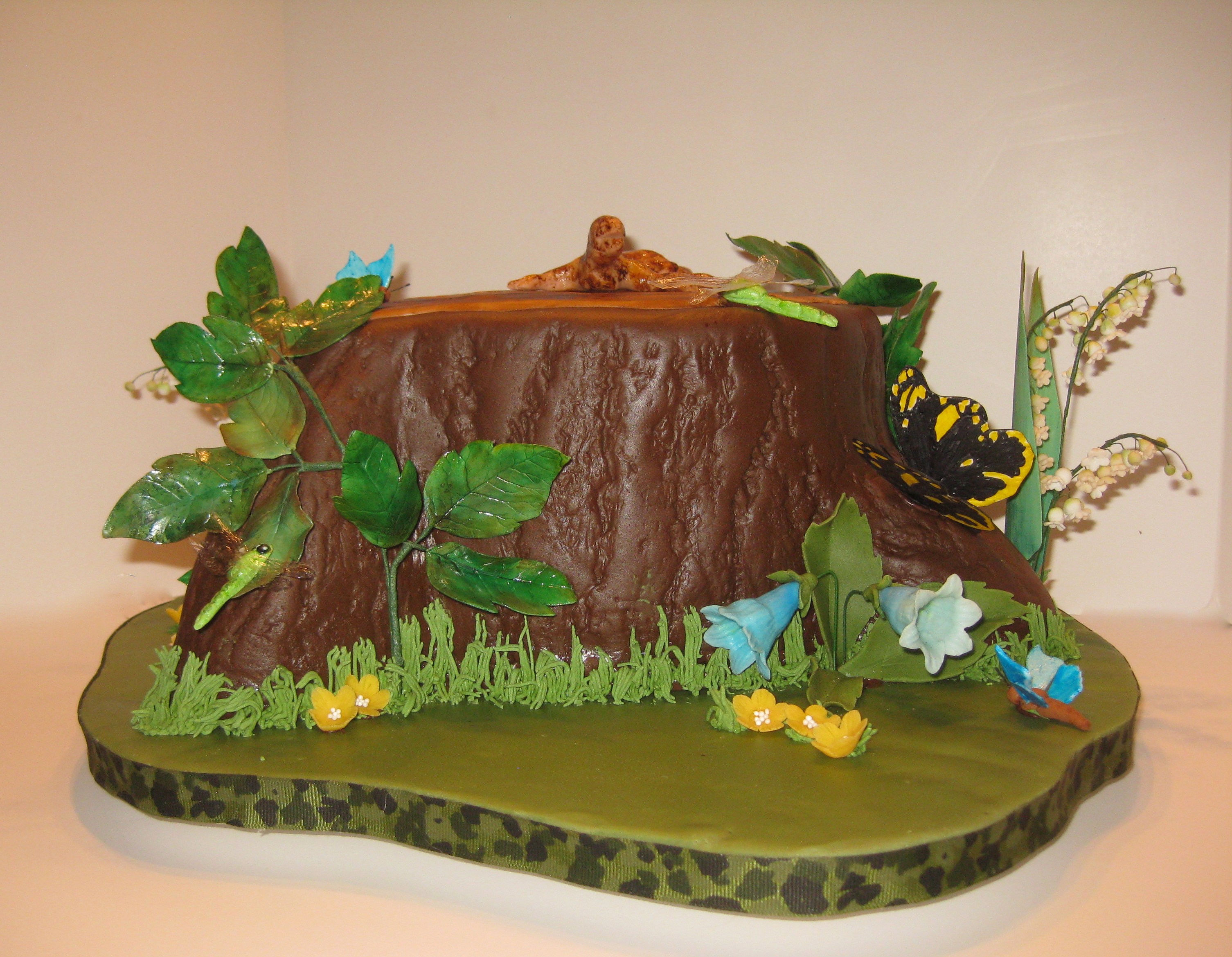 I get excited with each new cake I make. But I think this might be my favorite so far. I was told by the daughter that her dad loved flowers and nature in general. I really didn't want to a floral which would look too feminine for a gentleman's 89th birthday. So, stump cake to the rescue. Living here in Missouri, we have a lot of poison ivy so what better to have climbing the stump than that hikers' dreaded scourge? I made a bark impression mold from my own oak tree and free handed the poison ivy. The concession to flowers was the Lily of the Valley which happened to be the birth month flower and his birth month.