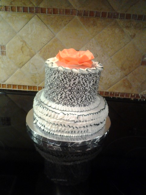 So this is very embarrassing, but here goes... Thank God this was a practice cake. Always loved the ruffle cakes so I decided to do this one all BC. So I did 2 tier cake; 8" & 6". The 6" tier had the Wilton's sugar sheet & the 8" did the BC ruffles....well what a mess. The sugar sheet went on fine, but when I took the tier out to check it ( and it was quiet humid that day) the sugar sheet started to ripple..wasn't liking that. Then add the BC ruffles using the #104, I knew I was in the hazard zone (noticed the rippling instead of the ruffling), because whatever I didn't do right showed right away so I started just to go with it, but as you can see I should have stopped ... live & learn. As you professional bakers state all the time, practice, practice , practice. I will be doing this again...any tips would be greatly appreciated.