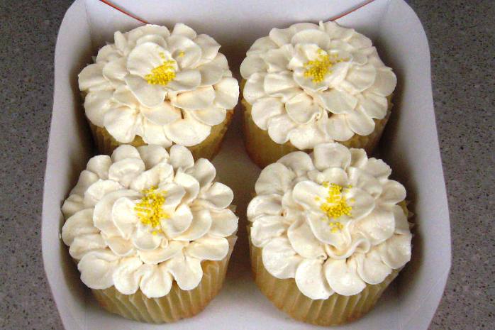and don't feel poorly about the flopping petals on the signature white flower design, the "C" tip ones. I had the same issue with some of the outside petals on my cupcakes. I found out why they keep all of those cakes in their fridge. I was thinking of stiffening up my SMBC next time with some extra butter & some sifted powdered sugar, just to give a little strength to the white flower petals.