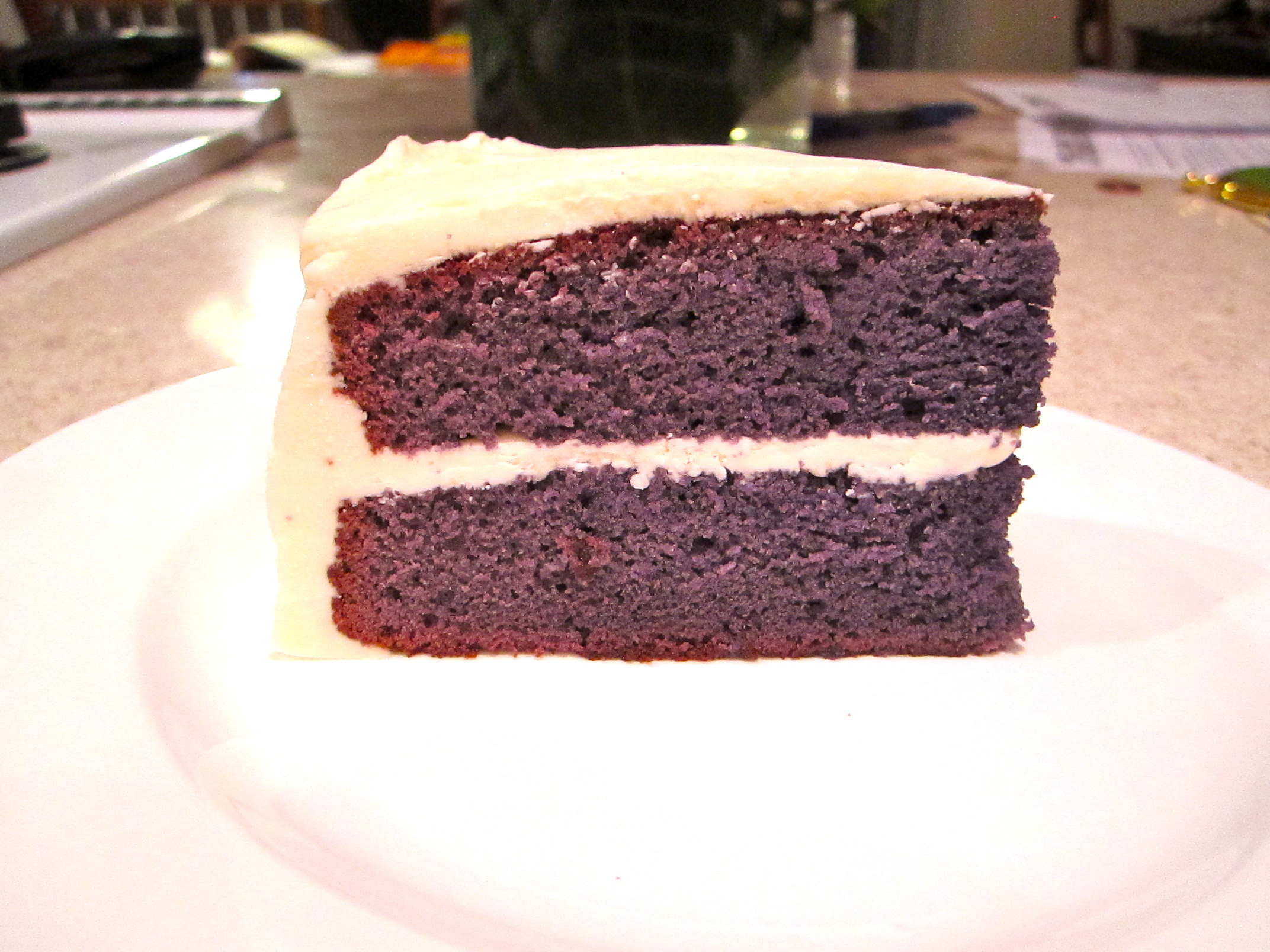 I started with my basic red velvet cake recipe which is 2 tbsp cocoa powder to 2.5 cups of flour. I split the recipe in half and tried 2 different ratios of blue and violet food color (Wilton gel colors). The natural reddish tint from the cocoa was hard to cover, which is why I neutralized it with extra blue in one of the cakes. (I did not add any red color to any of the cakes). The one without added blue still looked very red. In the other, by the time I covered the reddish brown color and made a decent purple, the cake baked up almost black. I then tried 2 more cakes. One with only 2 tsps of cocoa and one with no cocoa. The one without cocoa had a very pretty purple color but tasted bland. Might not even technically be red velvet anymore. The 2 teaspoons of cocoa powder were a big improvement over the first Cake with 2 Tbsp, but it still wasn't a pretty purple, rather dull and muddy. I was using Hershey's regular cocoa, which has a brick red color. I checked out my Hershey's extra dark cocoa, and voila, no red. Just nice brown. I made 2 more cakes, one with 2 tbsp and one with 2 teaspoons of cocoa, and each with approximately 2 teaspoons of wilton violet gel color. The 2 Tbsp version was quite dark, but the 2 tsp version was a very pretty purple. My taste testers liked it better with less cocoa as well.