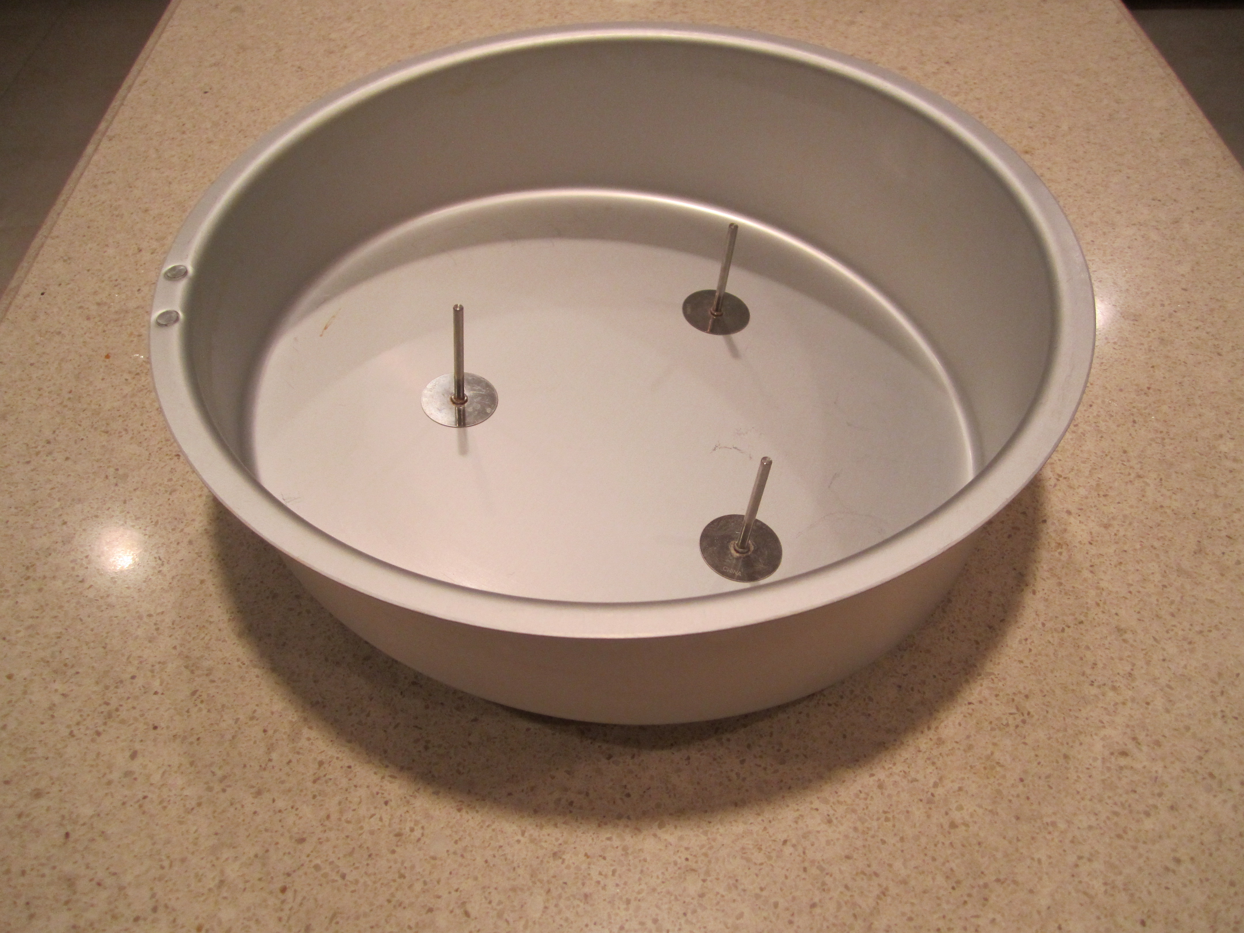 I just tried the 10" round pan and this time I put the flower nails in the deep end with the nail head on the bottom of the pan and the point pointing up. It worked so much better! It baked for 70 minutes. I am happy with how it turned out.