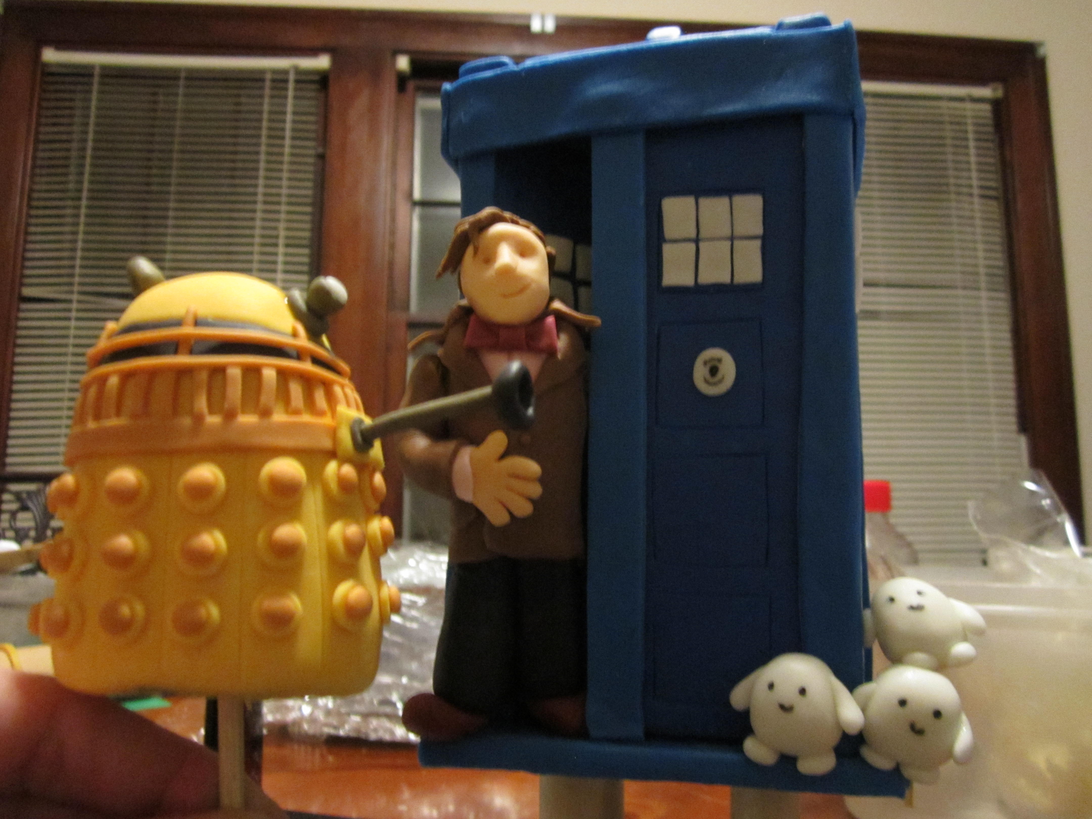 ATry not to overthink the tardis! Think in shapes. It is a box, covered in fondant with squares on it of different sizes to pick out the bevelling and the windows! Use small square cake tin, piece your fondant to get it flush. Print out a tardis net off deviant art http://cyberdrone.deviantart.com/art/Cubee-Classic-TARDIS-1980s-173833443, size it appropriately, use these as a template to cut your windows and bevelling out of fondant. Stick on. Pick out detail with paint. Voila. Ganache your cake to get the square edges crisp if you are a stickler for detail like me.
