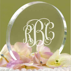 Try a compromise. Get a circle of acrylic and paint on or pipe on the monogram. It will be this nice and clear, and it will match the rest of the piping on the cake.