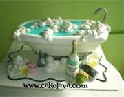 No pictures because the cake wasn't put together yet. Best I can describe how it was supposed to look is girl in antique white claw foot tub soaking in bubble bath with her racy lingerie on the floor. Kind of getting ready for her last fling. The sides of the cake were the 3 D glasses (half of the glasses) which were to stand most of the height of the cake on a 12" cake board. The lettering was to go on the board. Oh and the bride is all about pink and bling and long leisurely baths.