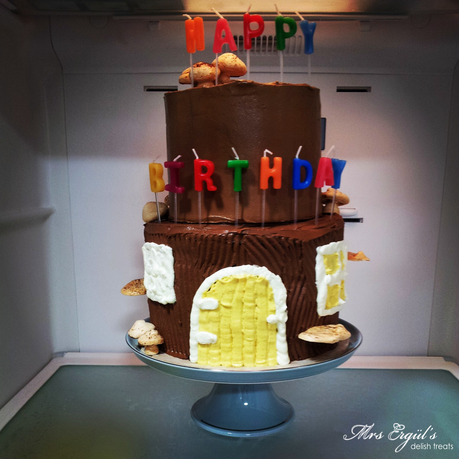 I have a full-time job and I only do this on the side. The party is on a Friday and every night of that week, after work, I went home playing with different fruits and spice powders to test out the colours on meringue buttercream frosting. After all the research, I settled on my trusty chocolate colour and planned to make it into a tree house. Throughout the week, I drew up some graphics of how the cake will look like. And I also made meringue mushrooms, a huge '1' chocolate cookie, the bunting and green tea sables which I plan to crush and scatter around the edge of the cake on the cake pedestal.