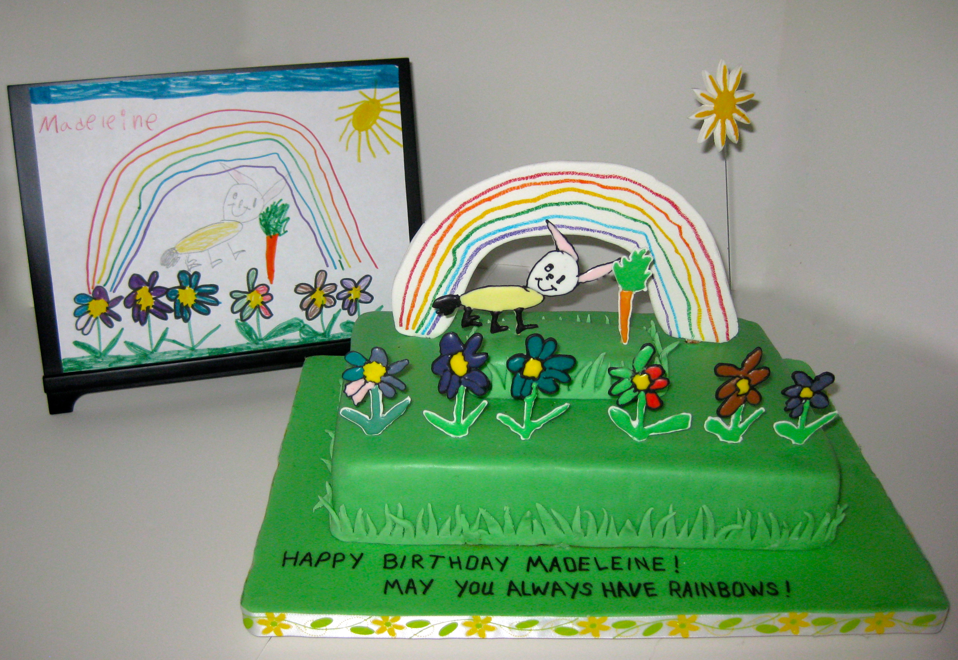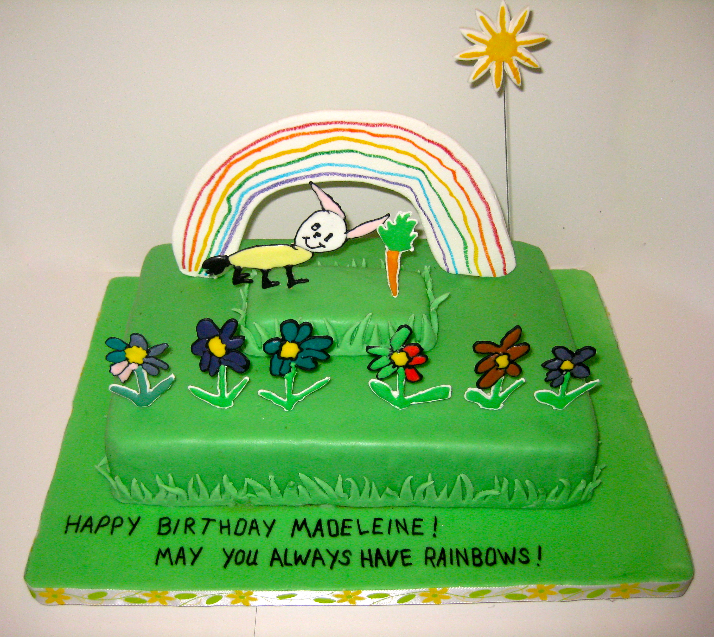 I've been enjoying this thread from its inception. Up to now I haven't had anything much to post...except now that I think of it-- I was making a cake for my sister's grand daughter's 6th birthday. We've always had a very good relationship, cake-wise and all other wise. I make our family cakes and she buys me new cake toys I cannot afford which I can use for other cakes. Win win, right? Well, her grand daughter asked for a very special cake and I agreed to make it to her specifications. We decided to make a cake like one of her paintings which always have a signature rainbow, with the usual children's sun in the corner,etc. I eagerly e-mailed my sister pictures of the cake in progress, the flowers that I replicated exactly as her grand daughter had drawn. I was floored by her response, "Aren't you going to put more flowers on it?" (Read that as, "aren't you going to put your realistic gumpaste flowers on it") I told her no, I was doing what I was requested to do by a 6 year old little girl who loves to paint. The real kicker came when she told me that she was going to go out and buy some fake flowers and [U]add[/U] [U]to[/U] [U]my[/U] [U]cake[/U] ! I told her that that would be the last cake she ever got if she dared to mess around with my design. Well, all turned out well and she said that it was the favorite cake I ever made for her. We simply hadn't been on the same page and she didn't see my vision. She thought she'd be getting a veritable flower garden, knowing how I love to make gumpaste flowers. The birthday girl was delighted to see her painting come to life in a cake. This is a long story since I can't seem to edit myself, but I'll post a picture so you can see what I was talking (at length) about: