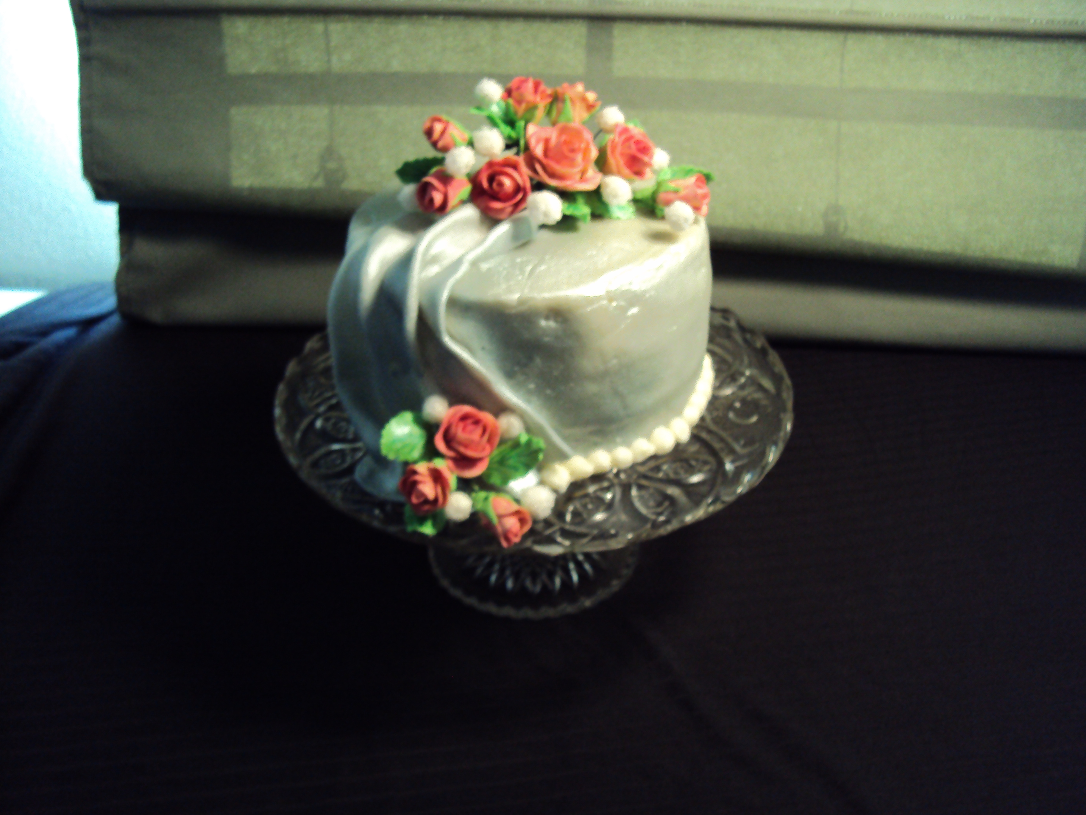 First is an anniversary cake. I was given a photo of the original wedding cake and told to have fun with it. Original was white with black swirls, so I reversed it and added flowers that matched the brides bouquet.
