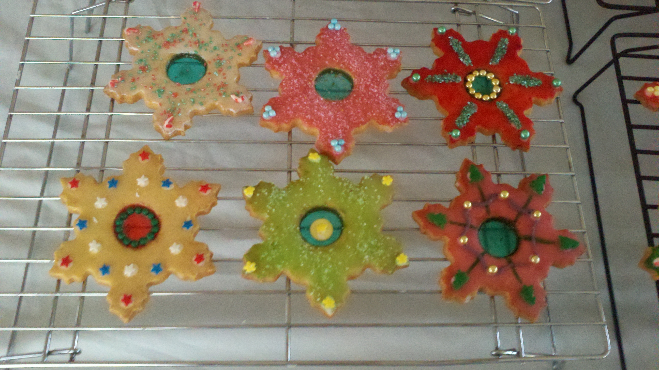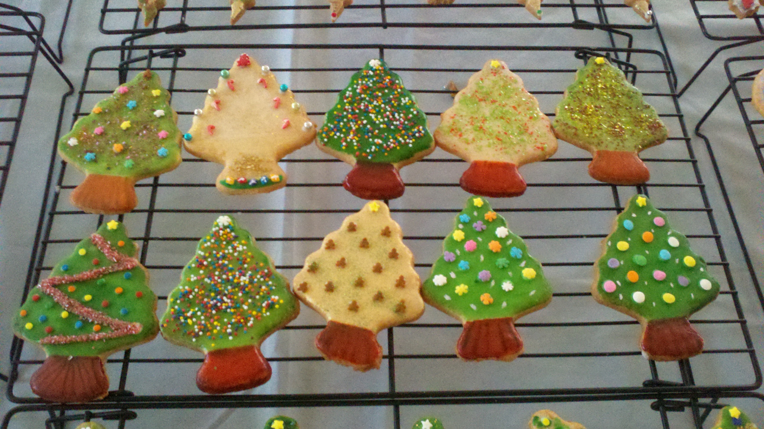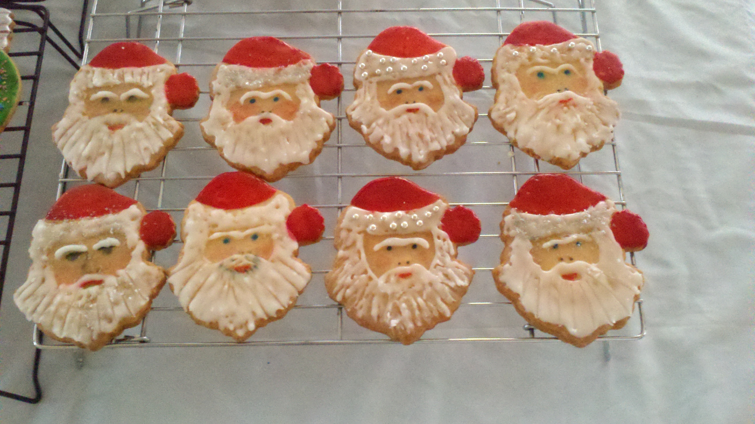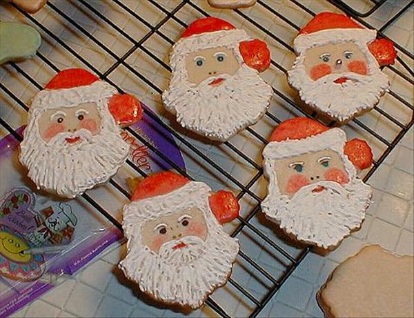 I use glace icing or glaze. It can be flooded like royal icing, but usually I apply the glaze with a pastry brush and let dry overnight. The Santa cookies in the first picture below were glazed; the beards are royal icing, the hats were painted (food color and vodka), and the faces were done with fine point food markers. For full disclosure, my mother did the faces, she's the real artist. The Santa cookies in the second picture were done totally with glaze. Sparkles are edible glitter.