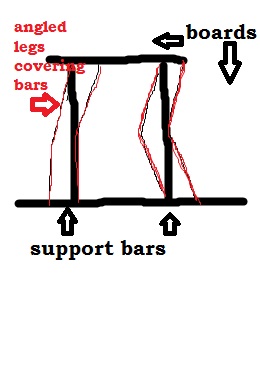 I did one and the board that the cake sat on was bolted to the base board using L brackets attached to those flat metal bars that have holes for bolts in them. The bars supporting the board under the cake were straight up and down, so the board wasn't going to go anywhere. I took some plastic boards and cut angled leg-shaped pieces in different positions that I put up against the metal bars, then covered them with candy clay. If you do it that way the angle of the plastic pieces makes it look like the legs are walking and it covers up the supporting bars. Here's a drawing, does this make sense?