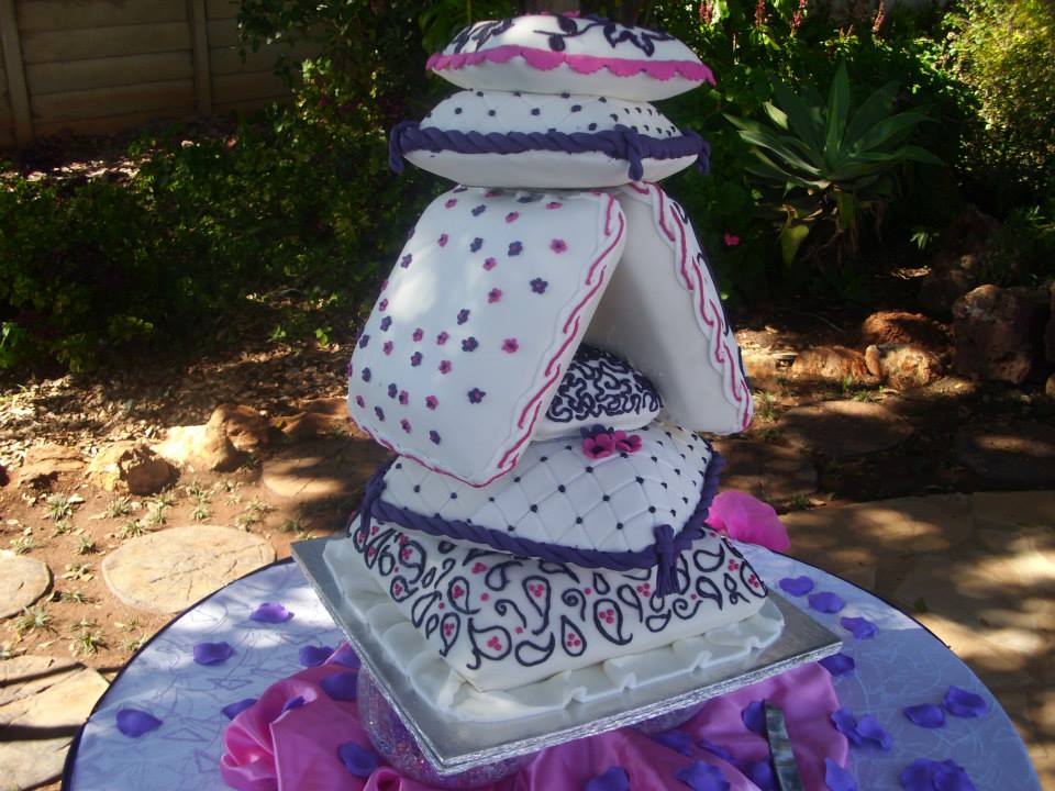 There is my version of the cake. All fruit cake. I used thick bamboo skewers as dowels. On the slanted pillows, I put long vertical ones that went right thru to the bottom tier. The cake survived the wedding. The couple has kept most of it since July 13. They have told me the two bottom have started cracking. I have advised them to dismantle the cake and keep each tier separate. Not sure about the ride home from the venue since I was not there. The two top tiers were placed at the venue. I will definitely charge PITA fee if anyone else wants me to do this.