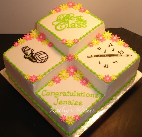 This is not a cake of mine, only using it for a reference point. A customer is asking for a similar design for a graduation cake. It will be for viewing only, thus a dummy cake is in order :) Not sure exactly how to price this one. I guess it's similar to a tiered cake and will be covered in fondant. Will be a 24 inch base with smaller squares on three corners. Any pricing ideas welcome! Thanks in advance :)