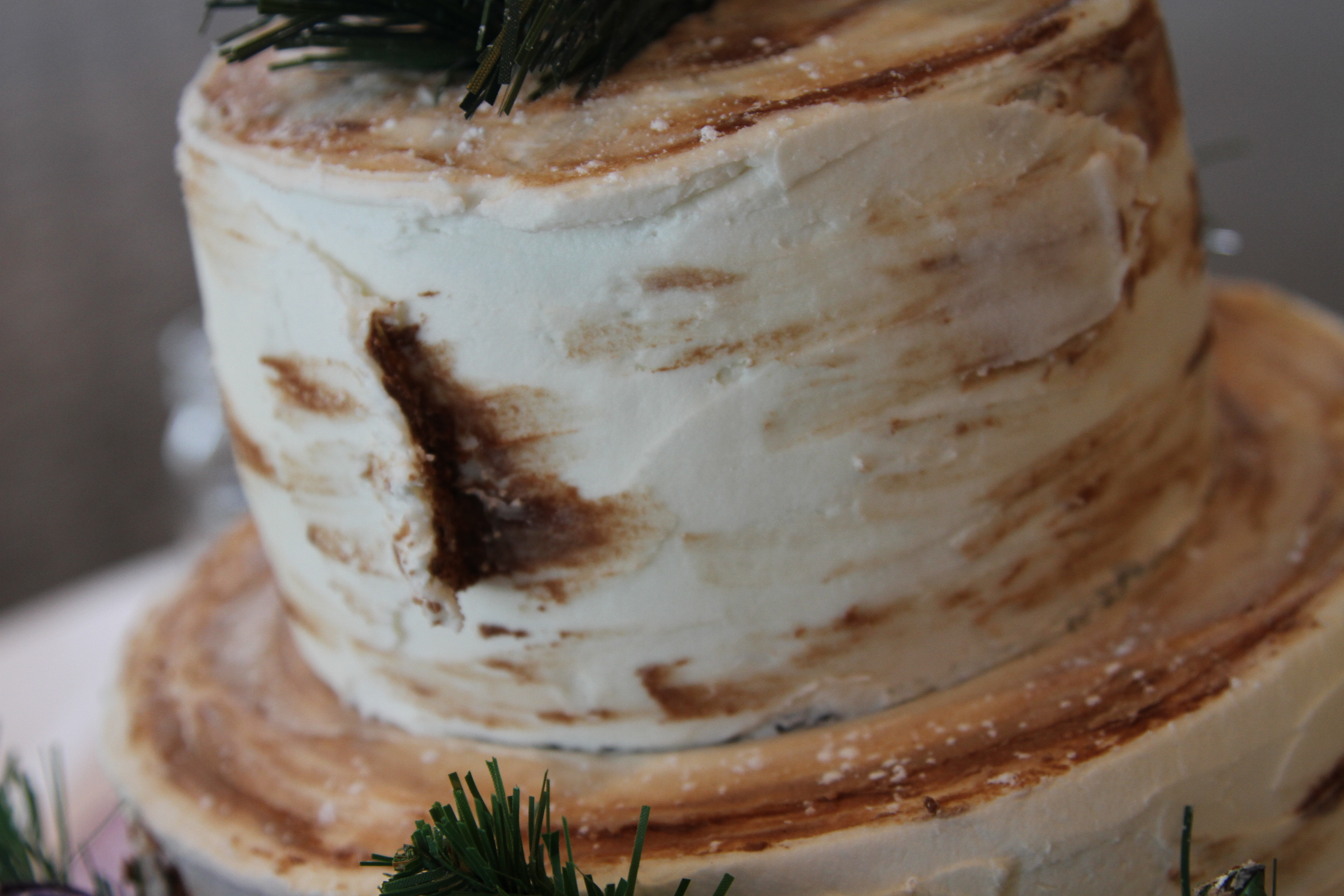 I made a 2 tier birch cake last December and used all buttercream frosting. I frosted the cake roughly with white, then went back and added "globs" of white with a small spreading knife, but pulled the frosting back with a sweeping motion to create the peeled bark effect. I tinted some of the extra white frosting a brownish color. I used a "brush-like" stroke with a small spreader to blend it in to the white in random streaks, finishing some areas with an actual water color paint brush to blend. It's hard to describe, so I'm sorry if I'm not making any sense...but after the wedding I was told some of the guests didn't even realize it was a cake, they thought it was just a decoration. Good luck with your project, I hope you have as much fun as I did!! ![]()