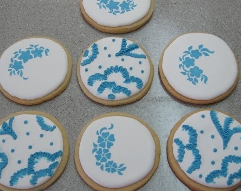 SOFT Royal Icing, WOW, I didn't believe it could be anything but rock hard. It is firm, smooth, easy to work on top of, yet has a non-crunchy bite. Ok so my outline isn't perfect, but it's better.  My hand embroidery isn't neat, but the stencil is superb!