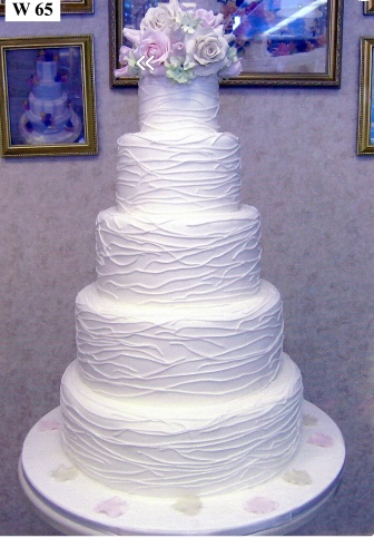 The rounded shoulders of each tier suggest fondant, though it could be done in buttercream, but the raised lines can be either. A piped line would be easier, and the breaks in the line suggest piping. Fondant lines would require at least three hands, two to use the extruder and apply the lines to the cake and one to turn the cake on a turntable.
