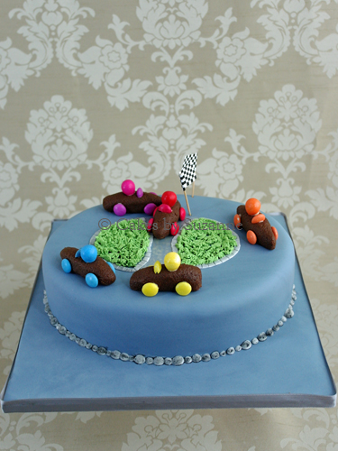 A very simple idea for a round chocolate cake is to make it to represent a round racing track and make some simple racing cars from a sausage-shaped chocolate truffle/cake pop mix. I used Smarties for the wheels and steering wheel and Smartie eggs (hard to get after Easter though) for the driver's helmet.