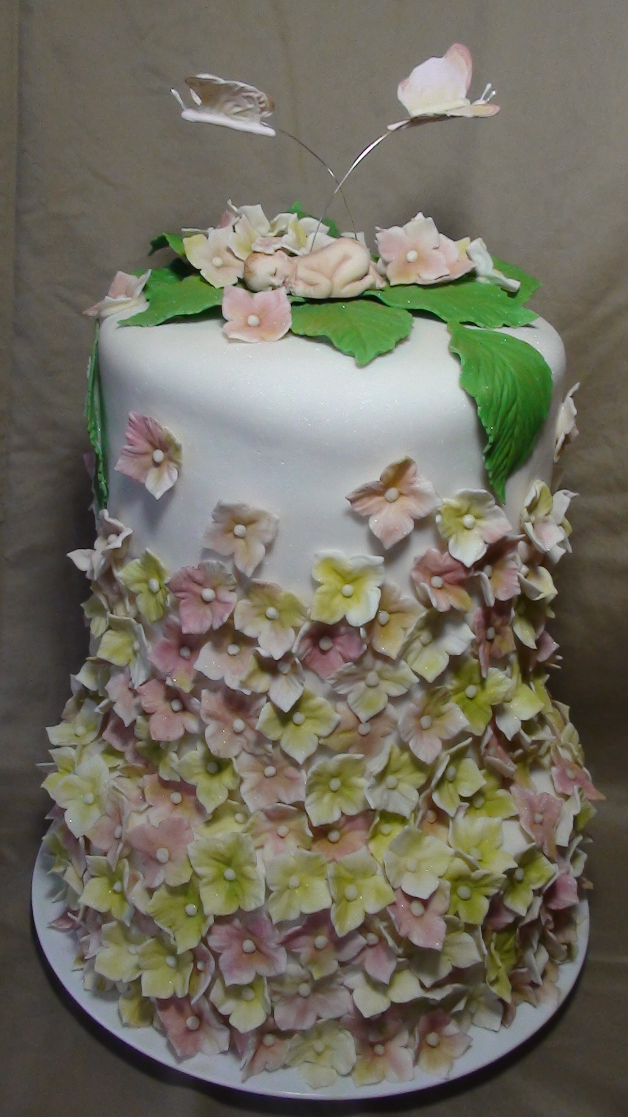 AThat is breath taking!! Must have taken for ever to make all those fondant flowers wow you go girl! Baby on top is a nice touch;)