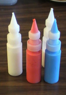 The ones I use are not the really small ones in the photo in the earlier post; mine are a bit larger and I believe they are made for chocolate; they come in a set of 18 or so. They can be used with regular tips, although the threads are slightly off so they don't fit perfectly. Filling the larger ones for flooding is easy -- you just pour the icing in --but I have to say, getting the stiffer piping icing into the smaller bottles is a pain. I bought a big syringe-type thing at my cake supply store, and it works pretty well. It has a barrel that holds roughly the amount that the bottles do, and you can just put a large tip on the end and easily fill the bottles. (I have tried filling pastry bags using the plastic wrap method, and then "piping" the icing into the bottles, but I think the syringe is easier and neater.)