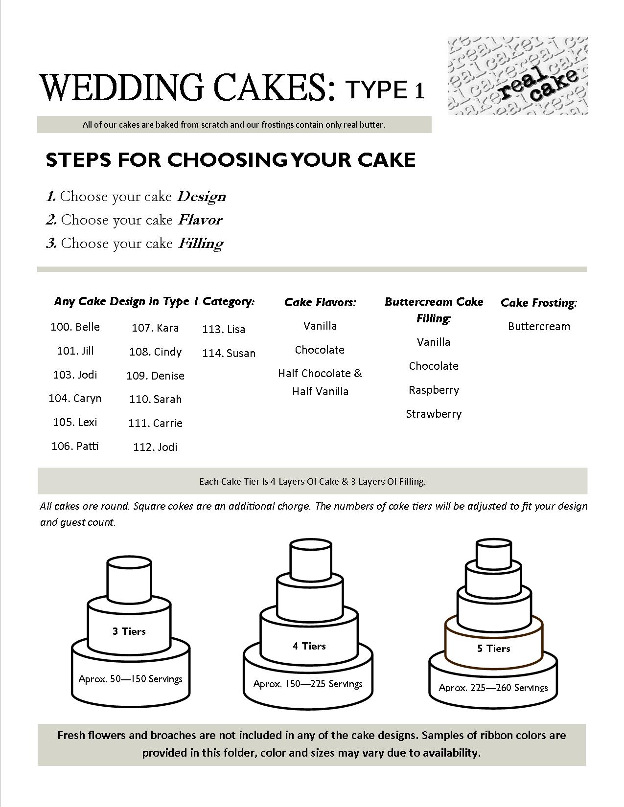 Those are the only options I offer at that price. The designs are all extremely basic like with a bead border or a ribbon around the base. Cakes are only all white. I deliver to the kitchen (when it's convenient for me) and I don't set up or put any flowers on the cake, etc...