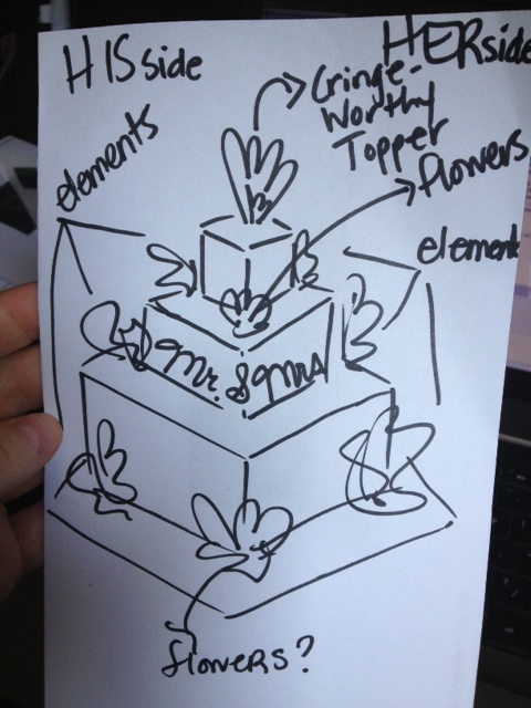 Would doing the squares with the corner at the front of the cake table help with the division of he-said, she-said elements? Make the left side him and the right side her. Maybe on one of the tiers, toward the front corner that's pointing forward...nevermind. SEE SKETCH...much easier that way!