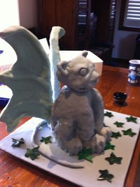 Anyway my question is: I am going to attempt this gargoyle for my friends birthday as she loves them but I'm afraid of the wings as they are quit big and I have not a clue as to how I can get such heavy set wings to stay in place and secure. I was thinking rice crispies to keep it light any other suggestions would be most welcome.. Also what sort of wire would I get to try shape the wings?