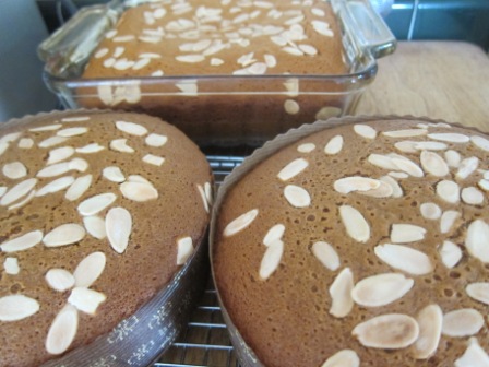 Put the syrup into a large mixing bowl. Put coffee into empty syrup tin and fill tin with hot water. Stir well and pour into the bowl (tin will be hot!). Add everything, except eggs, flour, baking powder and bicarb. Mix with a wooden spoon – do not use an electric hand mixer at this point! Add eggs, mix, then sift in the flour, baking powder and bicarb. Mix again, (do not worry about the mixture being lumpy, at this point) then use an electric hand mixer to smooth the mixture and to get lots of air bubbles into the mixture. Empty into the tin. Sprinkle with flaked almonds.