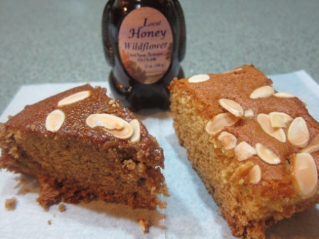 For this recipe (bottom photo, round cakes in front; top photo, slice on left.) I started with my gingerbread recipe and subbed honey (instead of molasses) and coffee (instead of water). Recipe here.
