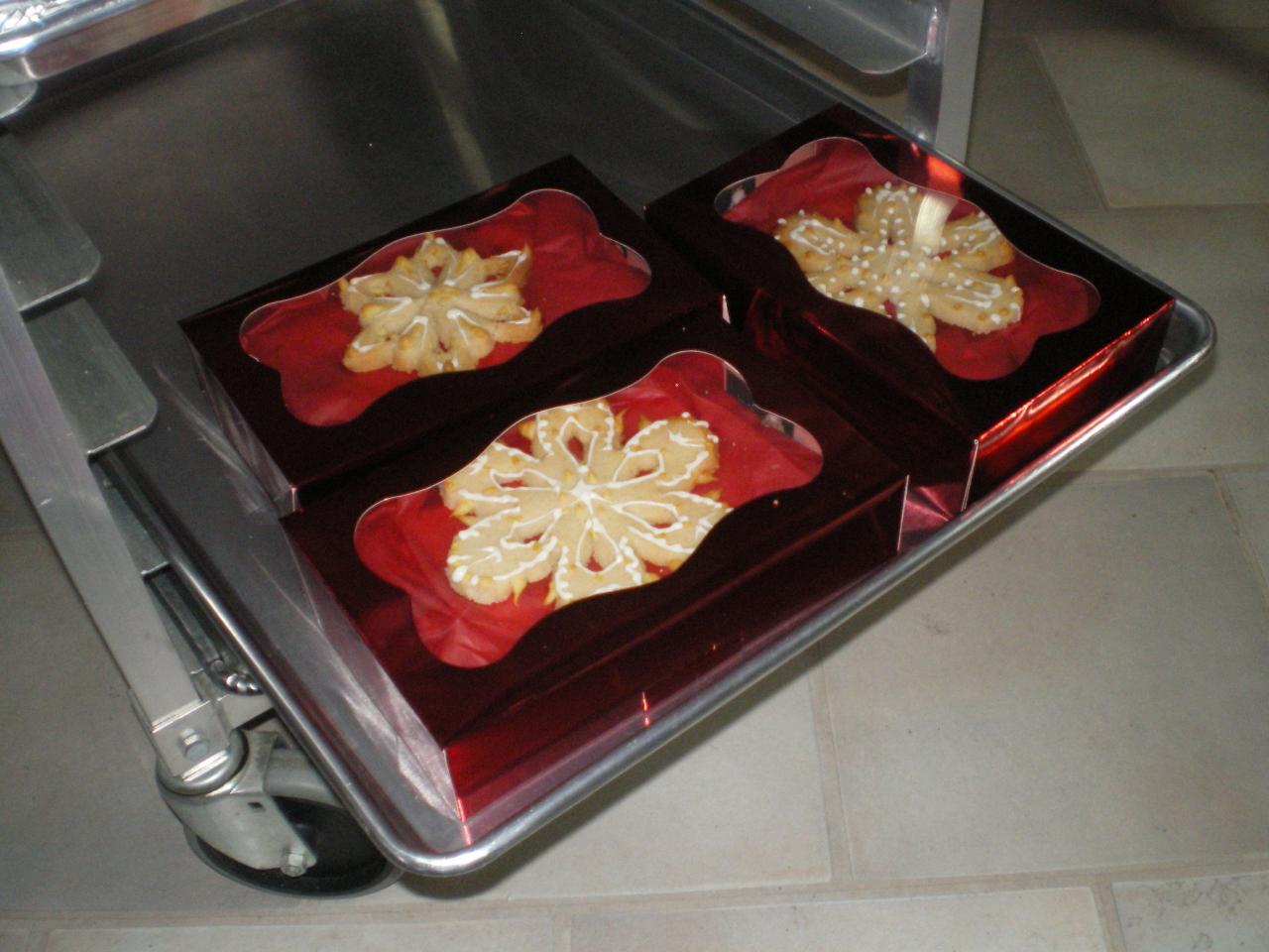 gold window boxes no less--i can fit six muffin papers in each box and each muffin liner held one star shaped caramel sandwich cookie, two pecan linzer cookies filled with southern comfort tea jelly, and then a small snowflake cookie on top i think--and then setting on top of those were two giant snowflake cookies that peeked through the window on top--something like that--