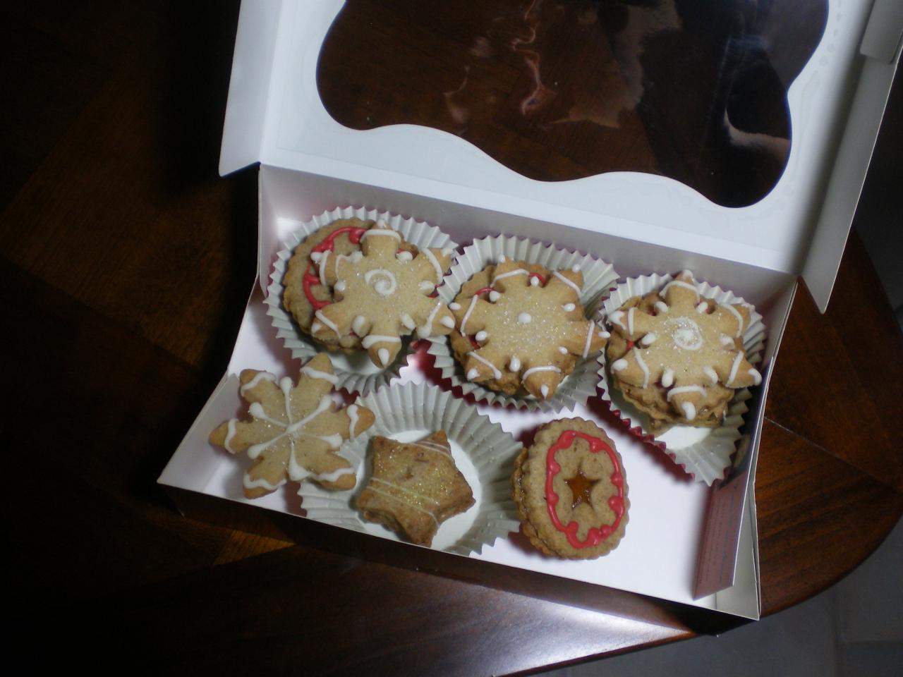then there's the star caramel sandwich and the red rimmed linzer topped with a mini snowflake--so anyway there's my boxes