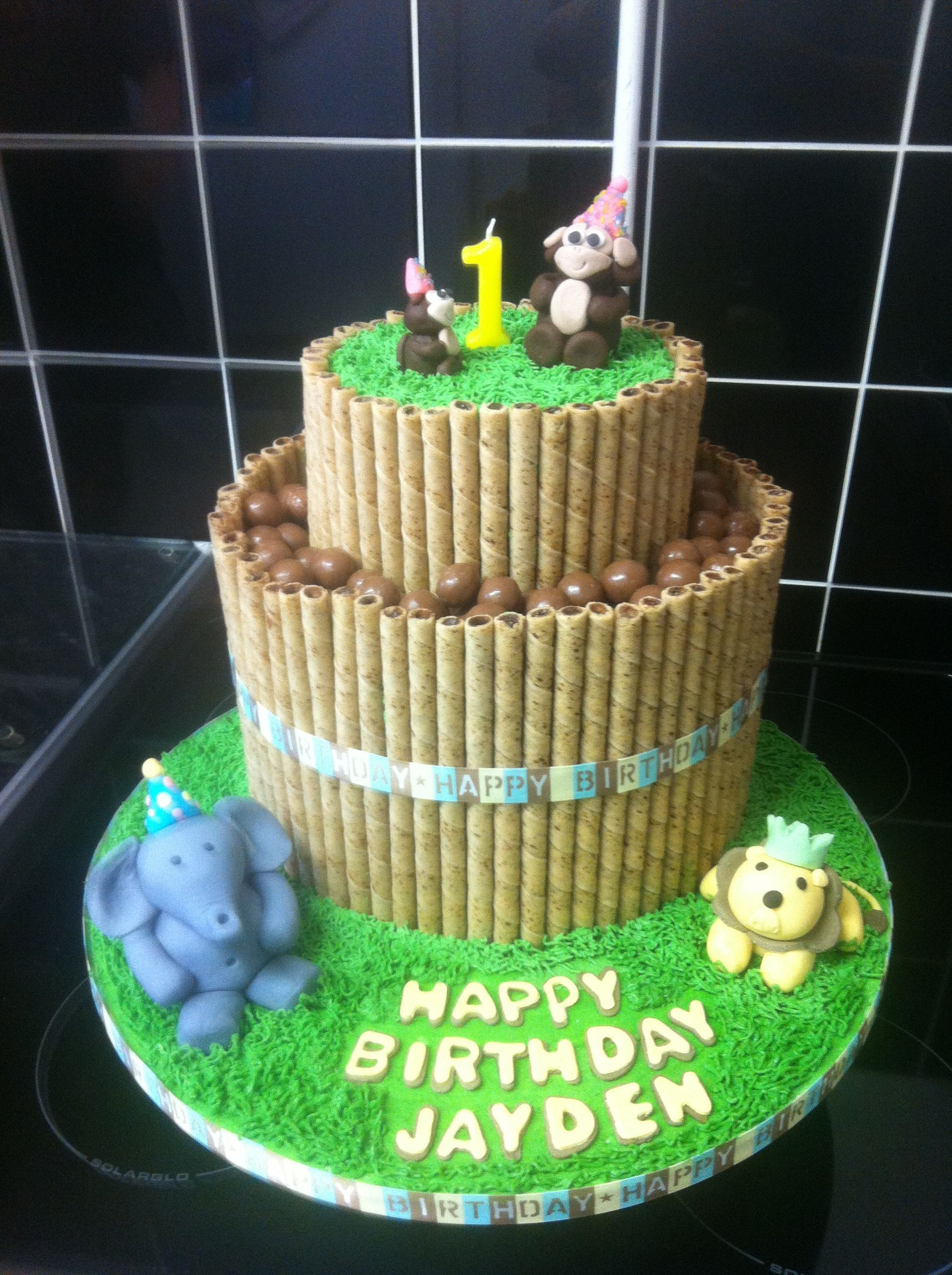 This is my 2nd two tiered cake made for my grandsons birthday last week. First time I've made fondant figures and wasn't happy with the wafers being a bit higgeldy piggeldy on the bottom left but overall I was happy. And, the baby and his parents were delighted. (My family always are, they think every cake I make is a work of art!)