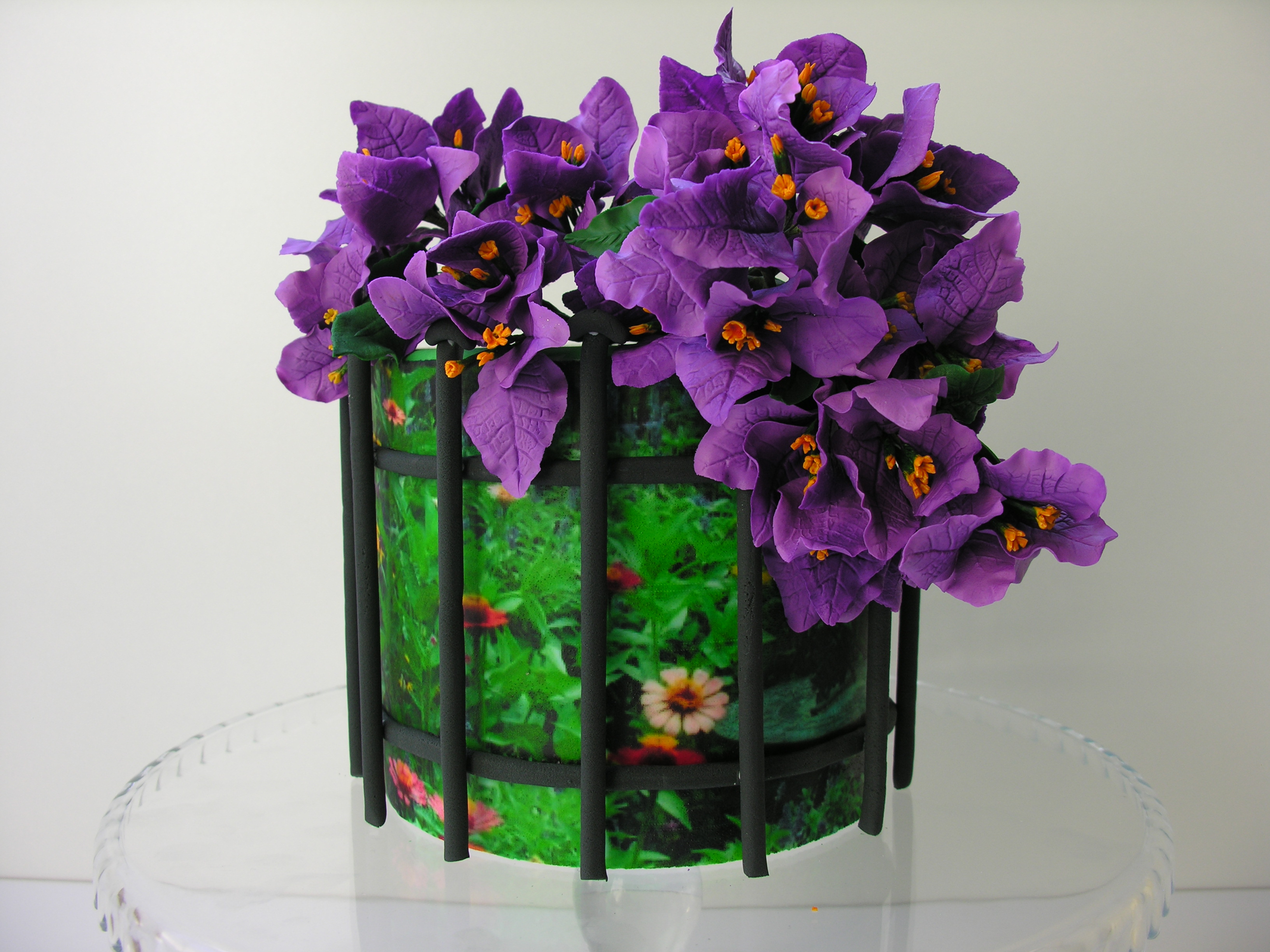 O.K., I thought after all the effort I went to I should use last week's bougainvillia. I decided on a 'through the garden fence' theme. Used an edible image that I printed for the garden, made the fence out of gumpaste and then sprawled the bougainvillia over it. Looks a bit messy but that is how bougainvillia is. I was pretty pleased with the effect. It's fun to become obsessed with a concept and then have it work for you