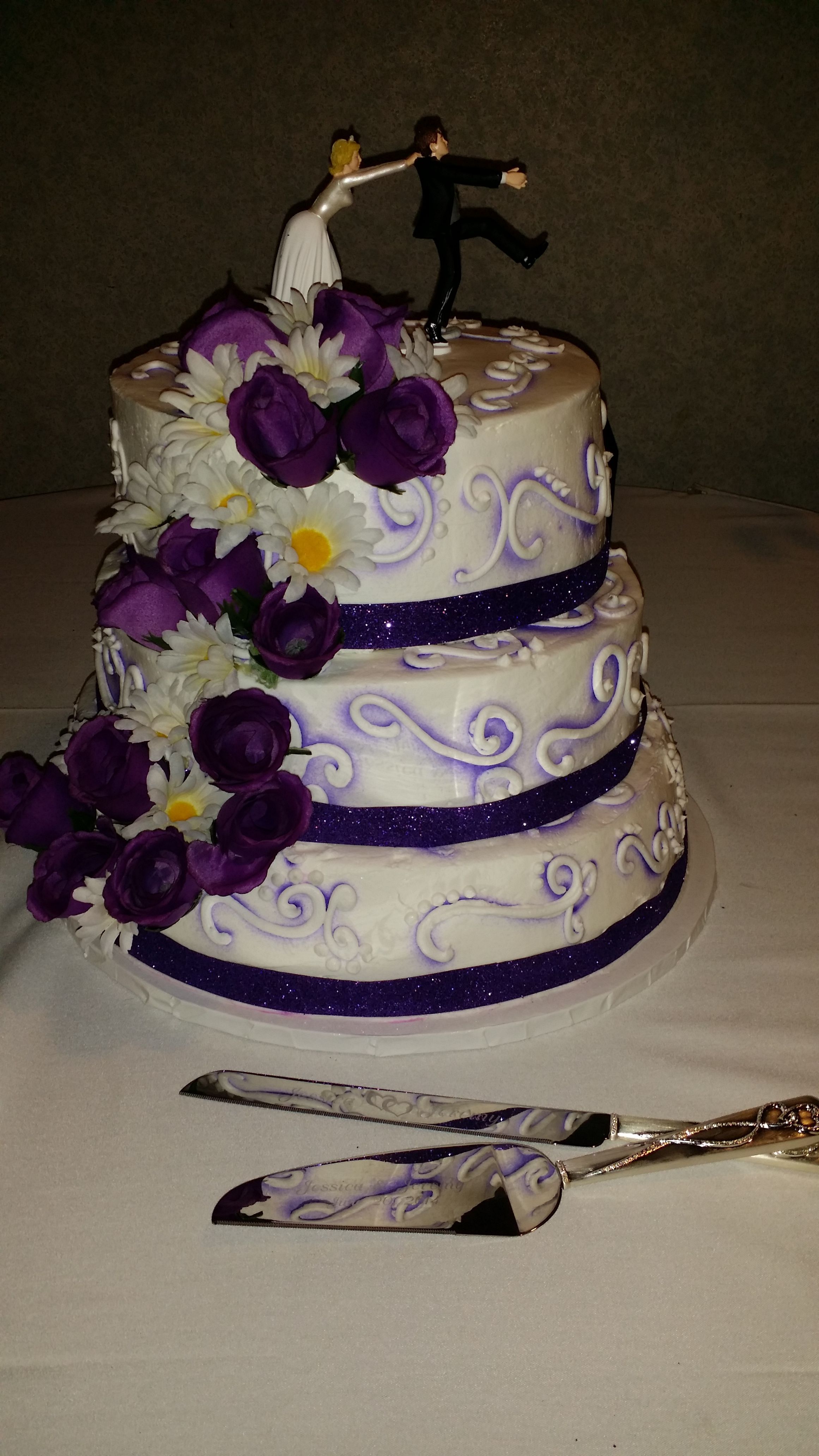 Now concerning your cake.....I love the accents of purple that make the cake POP! The scroll work is beautiful. And to have driven an hour and not had a cake disaster in the summer speaks volumes!!!