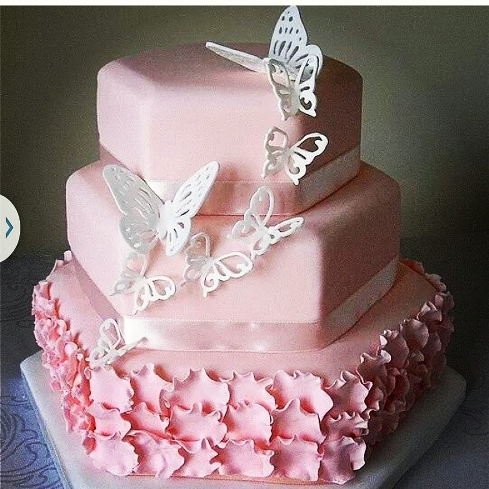 AI would charge a small fortune to make a three tier hexagonal cake to serve 15 people with those petals & butterflies