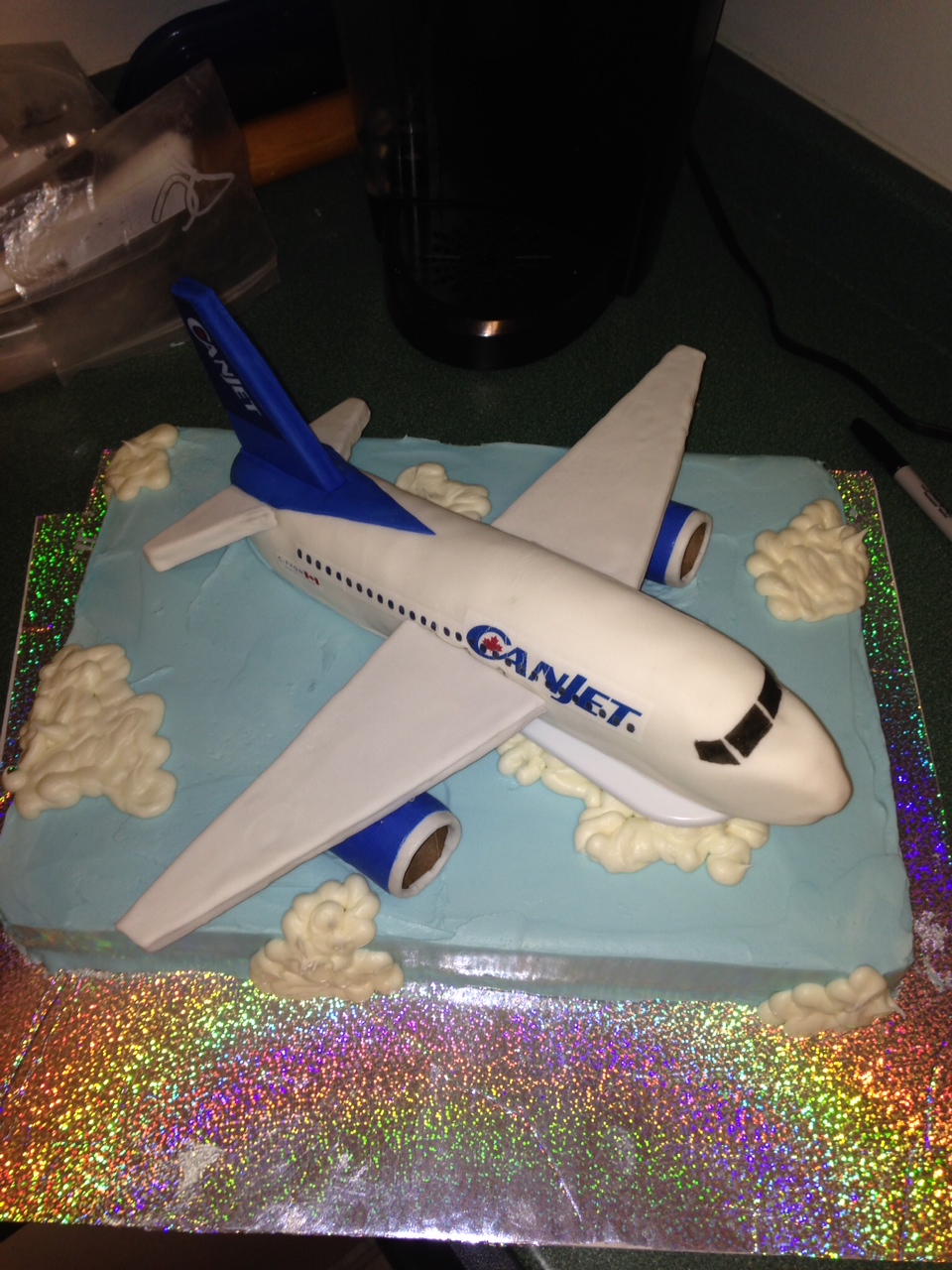 I am making my father an Airplane cake for his 60th birthday at the end of July. I need it to look like the actual plane as much as possible. He fly's a Boeing 737-800 for Canjet. I have planned to make the body of the airplane out of rice crispy treats and cover it in fondant. I then plan to use edible images for the decals etc on the plane.