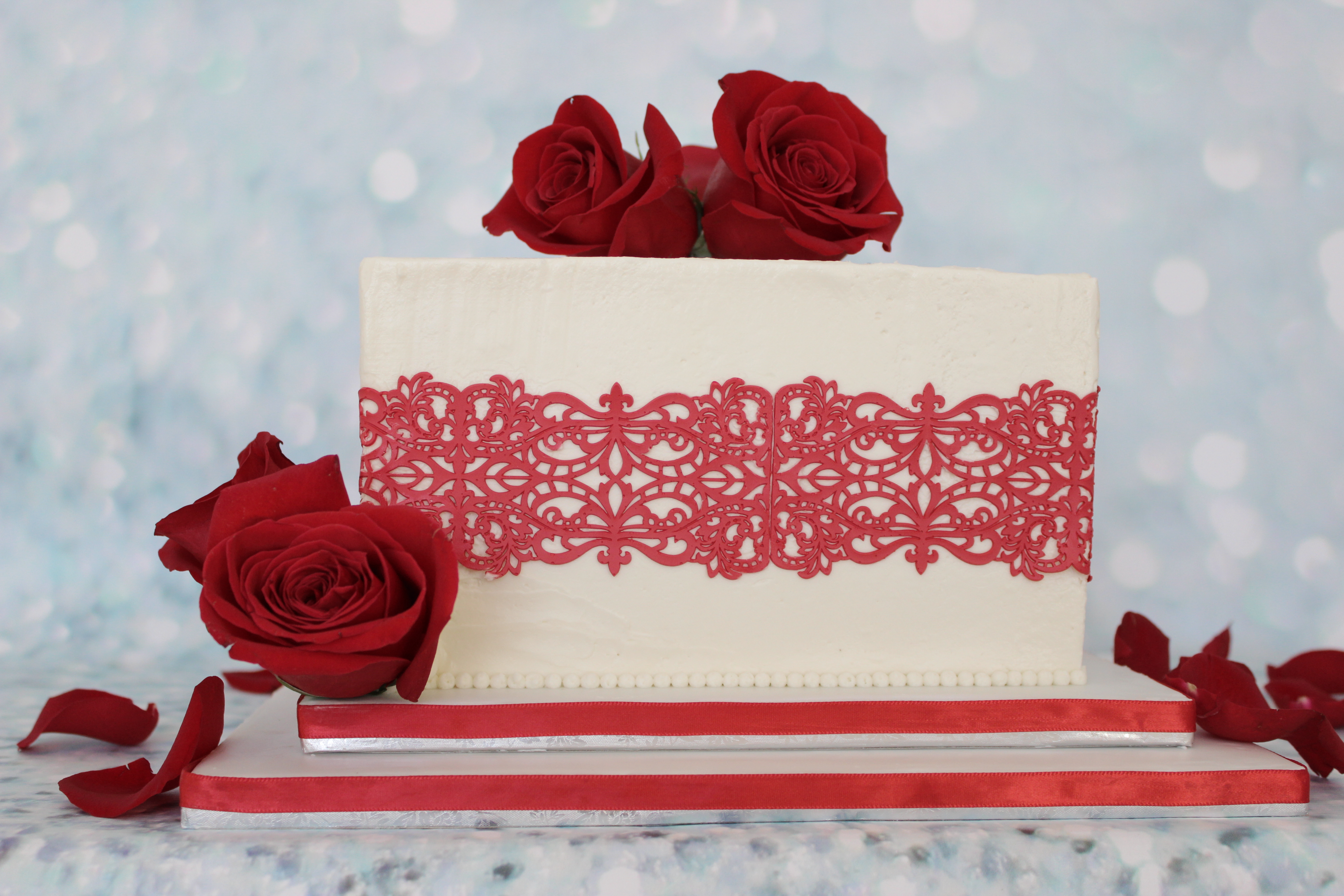 Cake lace on SMBC. It has been in refrigerated over night ( with cake lace on) and now it is out at room temp for 3- 4 hours just to see how everything goes.