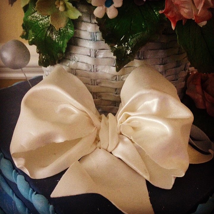 Decorations: Flowers, bow, curlicues, pearl balls-gum paste. Basket weave-fondant.