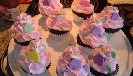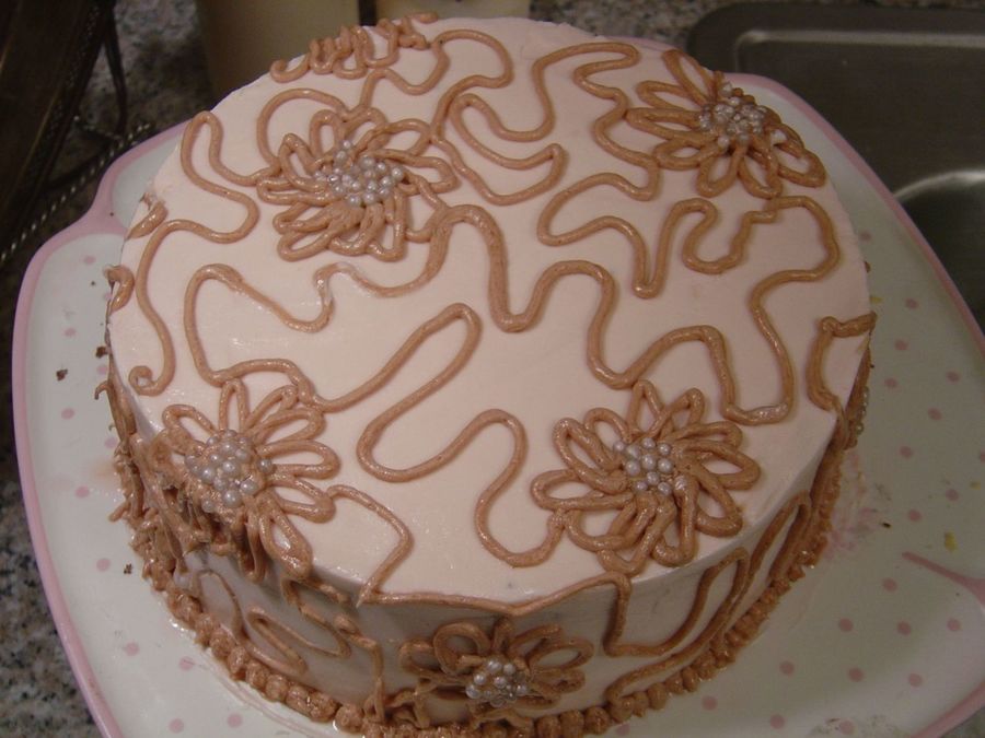 This is a chocolat cake with hazelnut buttercream in the middle and hazelnut buttercream as the decoration. there are little pearls as the inside of the flowers, I was board tonight.