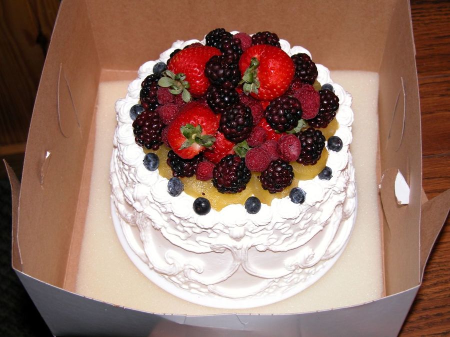 trifle cake with stabilized whipped cream icing and fresh fruit