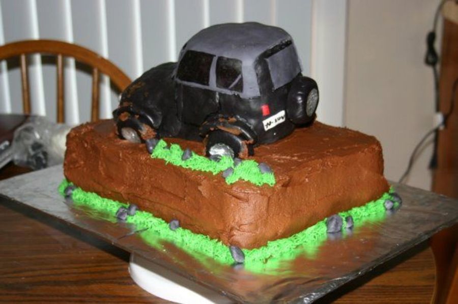Grooms cake. Jeep is made fro rice krispy treats and covered in fondant. Cake is all chocolate