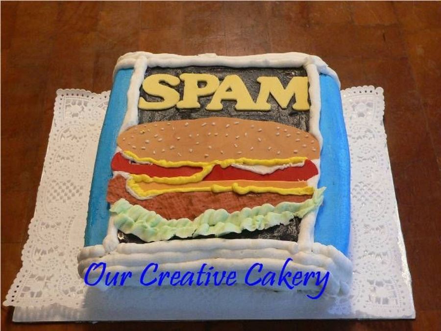 Groom's cake for Spam fan. Chocolate cake with cho. ganache frillin Buttercream with fondant accents. Thanks for looking