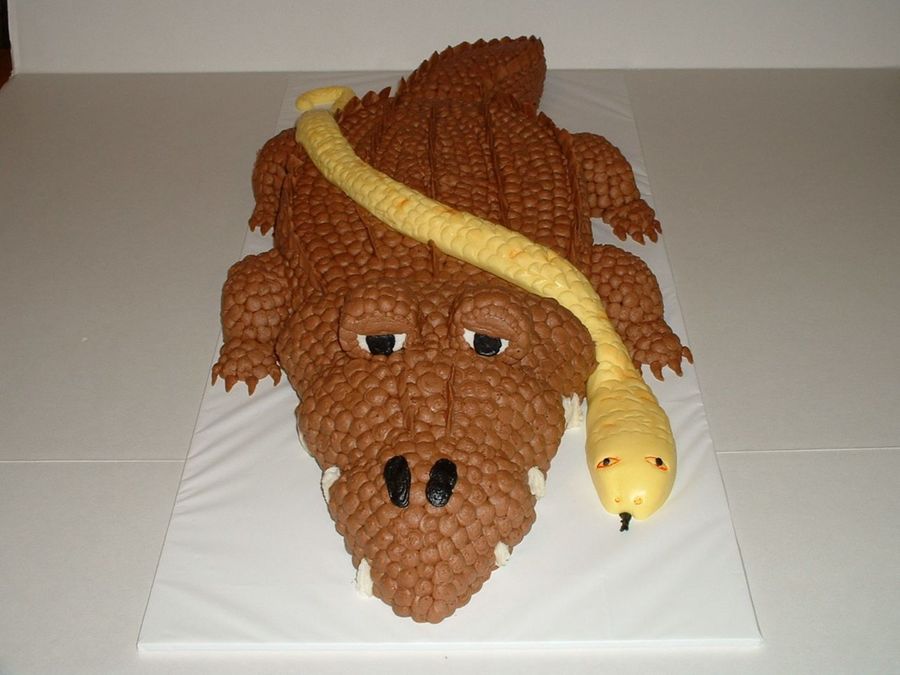 This cake was requested to be all chocolate and to look as real as possible. The little boy had real animals at his party including the snake. The alligator's head was made with the Christmas tree pan and the body just cut to shape. The snake is all fondant. The scales were done with the fat side of a tip inserted at an angle to form the scales.