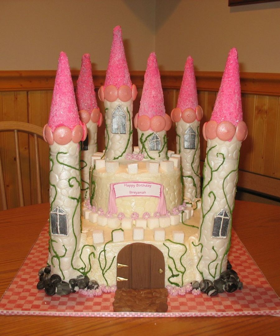 2 layer 6" round on a 2 layer 10" square. Towers are paper towels rolls covered in MMF. MMF for door, windows, banner backing & tassels, rocks & flowers. Candy melts to trim towers. BC on cakes & vines. Stone impression mat. Ice cream cones for towers tops covered in RI then dipped into crushed sugar crystals. I've given up on my writing so I did the happy birthday paper in the printer; then stuck it to a pice of fondant & used that instead...looks great!!!! Not as time consuming as the last 2 I made