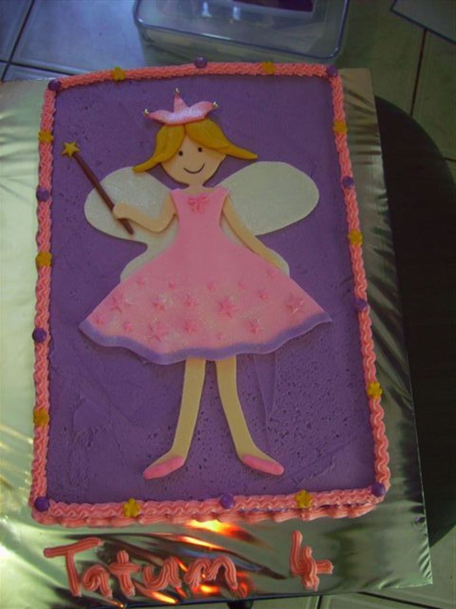 The cake is sponge covered in butter icing. The fairy is made out of sugarpaste. Firstly I cut out the wings. I then cut out the body laying it over the wings. I then did the dress. I stuffed sponge in at the bottom so that the dress would not be flat. Shimmer dust gave her sparkle.