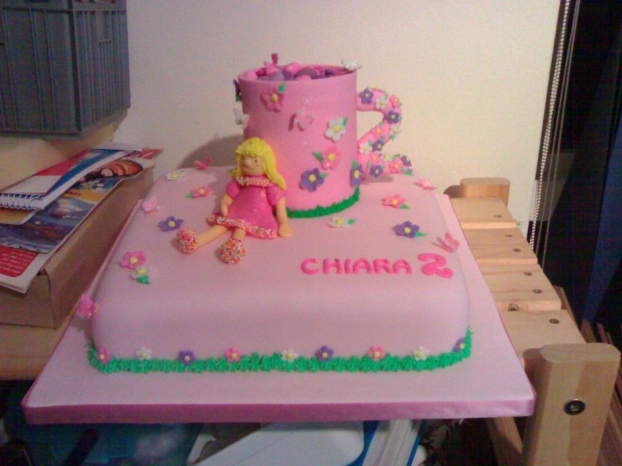 Square sponge covered in sugarpaste. Ragetty Ann (Debbie Brown idea) is made from modelling paste. The mug (Mary Ford idea) is polystyrene covered in modelling paste.